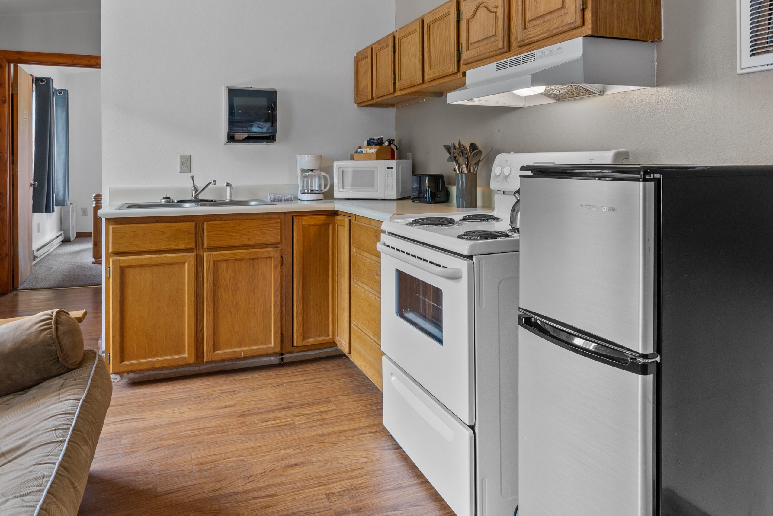 The Eagle’s Nest is a cozy, efficient apartment located above our main office. It features a private bedroom with a comfortable queen-sized bed.