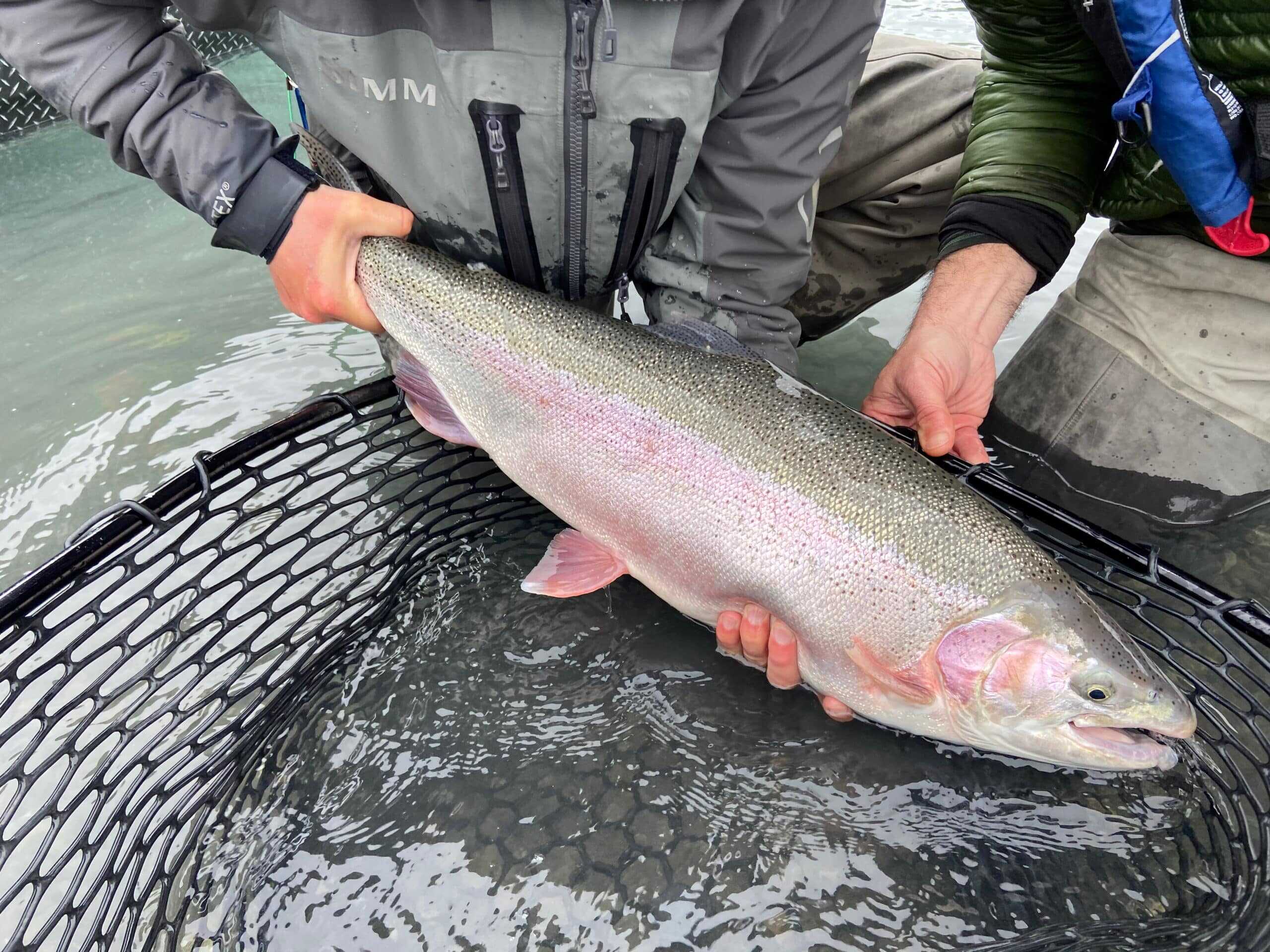 The Kenai receives a run of pink salmon in even years (2024, 2026, etc.), which adds even more food to the system. Bead bites start around mid-August and continue into later September. Late in September, the spawned-out salmon complete their life cycle by dying and returning their nutrients to the river. Around this time, the rainbows and dolly varden will eat flesh patterns, leeches, and beads.