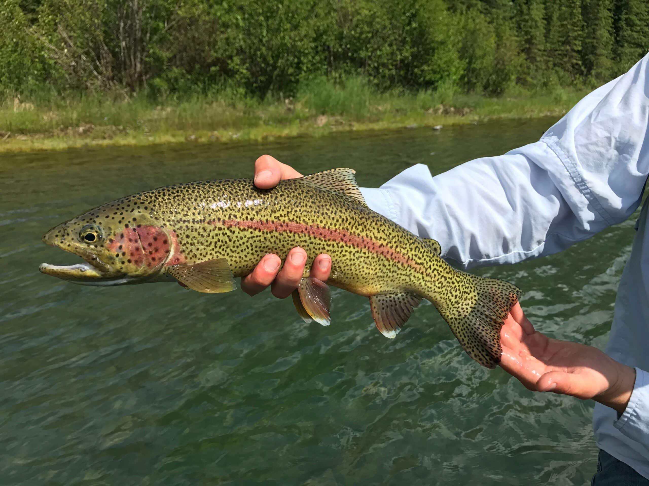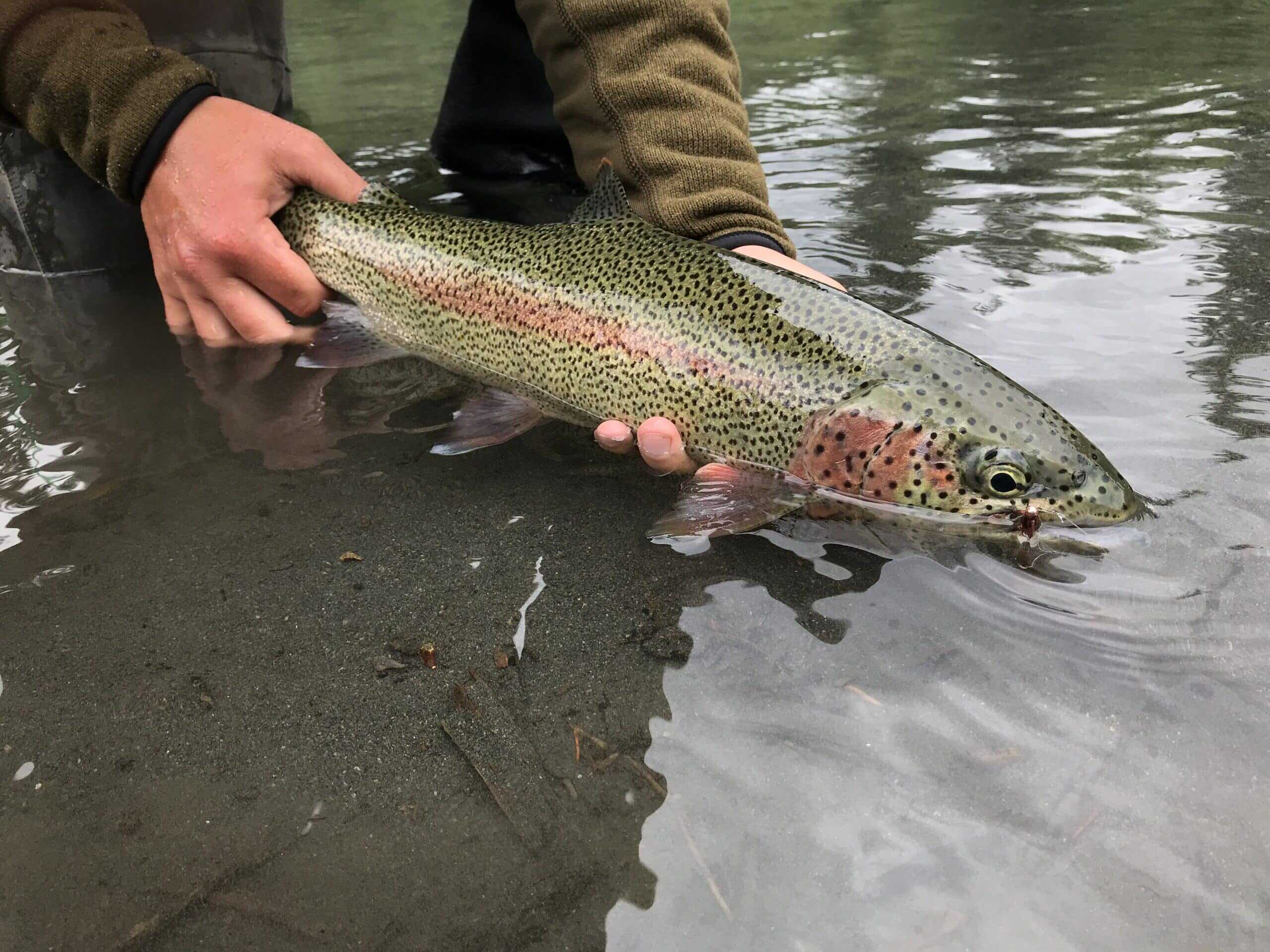 This trip requires a mildly physical wade. It’s flat, but requires good physical condition and balance as you climb over slippery stones and cross the creek in the current. All rainbow trout and dolly varden are catch-and-release only.
